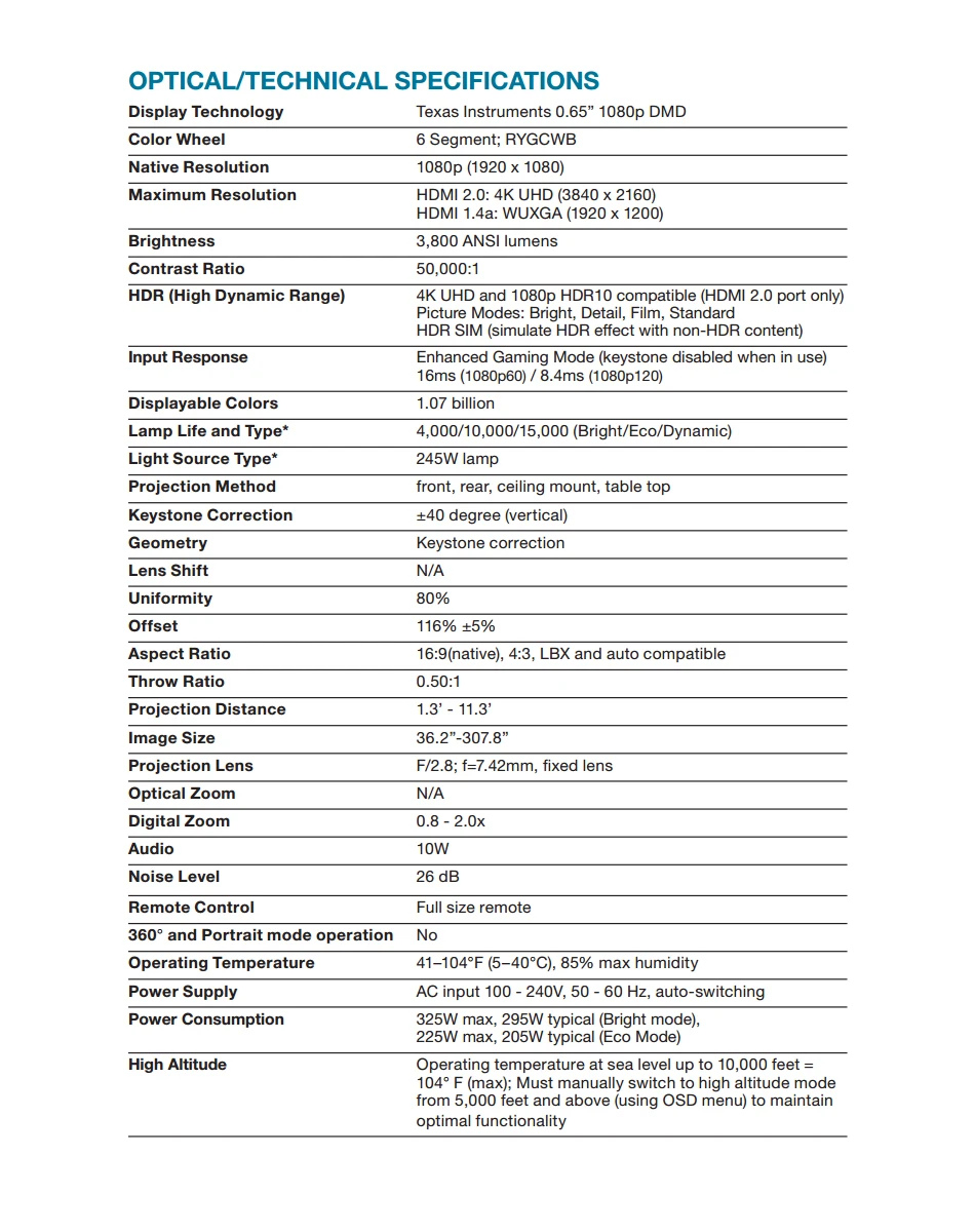 Keeping the lights on does not compromise Optoma’s Precision Optics with an ultra-bright light source engineered to handle ambient light conditions. The GT1080H offers big images in tight spaces, creating 100 inch projection images from just 1.1 meters away.