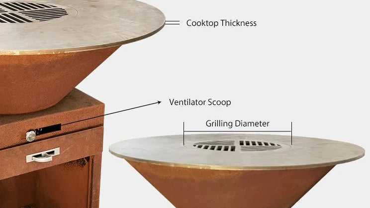 The cone-shaped hearth is rimmed with a steel rim in the form of a narrow top, which is heated from the inside of the hearth to grill, cook, fry and heat. The large working space of the plate allows you to conveniently prepare various types of dishes for up to 40 people. The shape of the grill encourages you to gather around the hearth, jointly prepare and celebrate meals outdoors throughout the year.