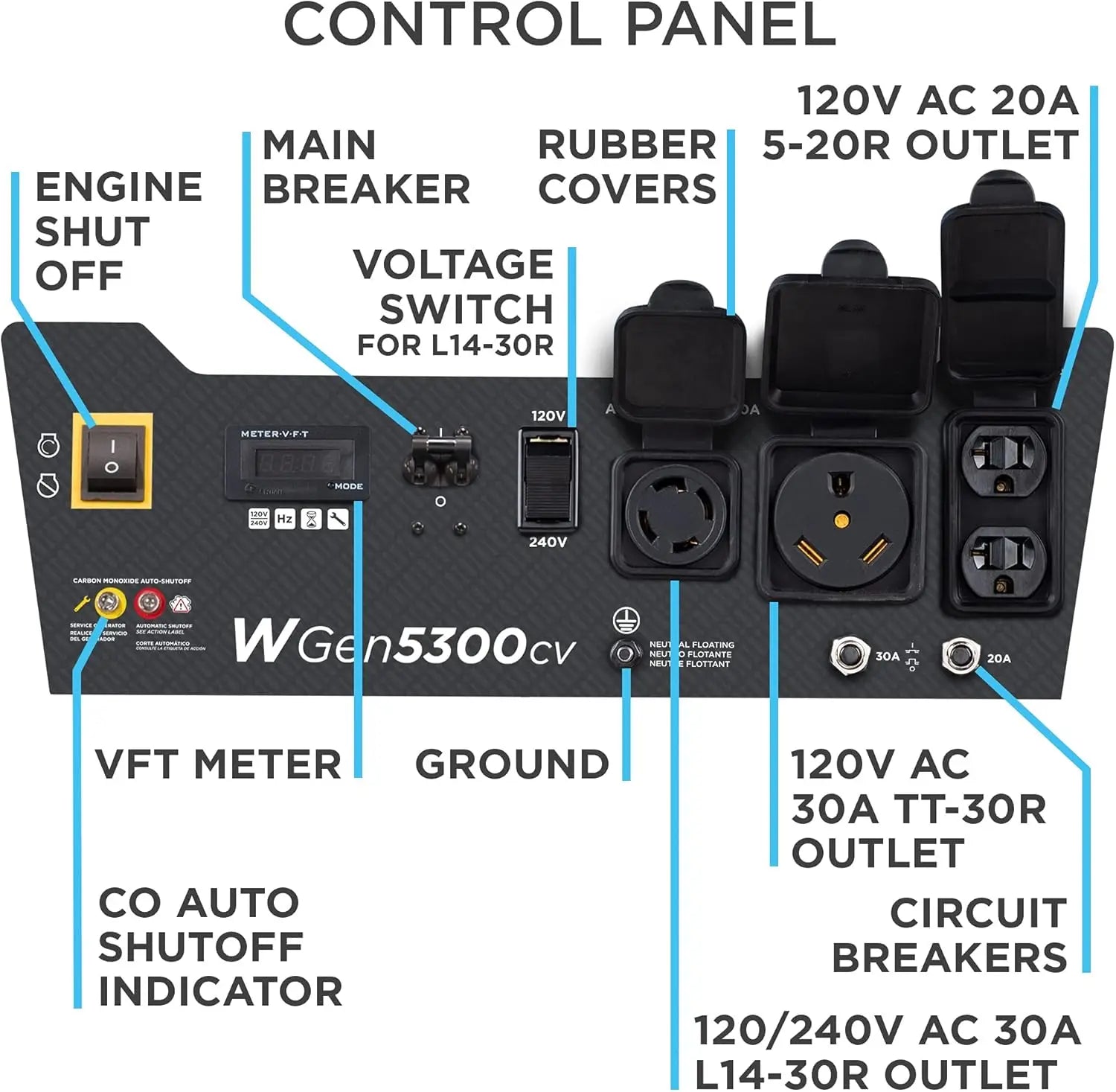 - 5300 Running Watts and 6600 Peak Watts; Recoil Start; 4. 7 Gallon Fuel Tank With Fuel Gauge; Up to 14. 5 Hours of Run Time Per Tank with 120/240V Volt Selector Switch