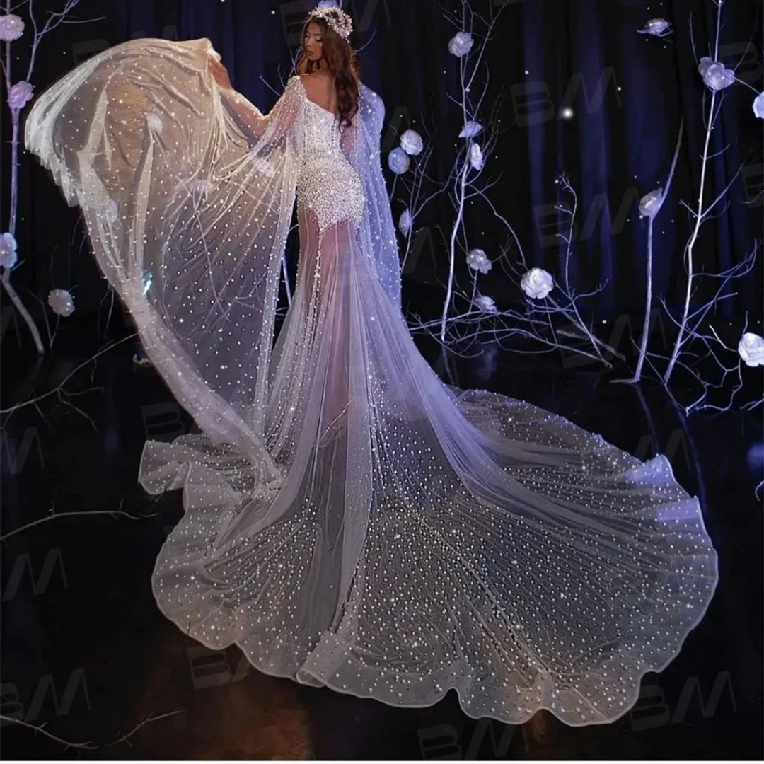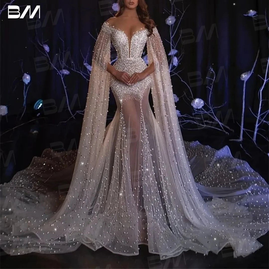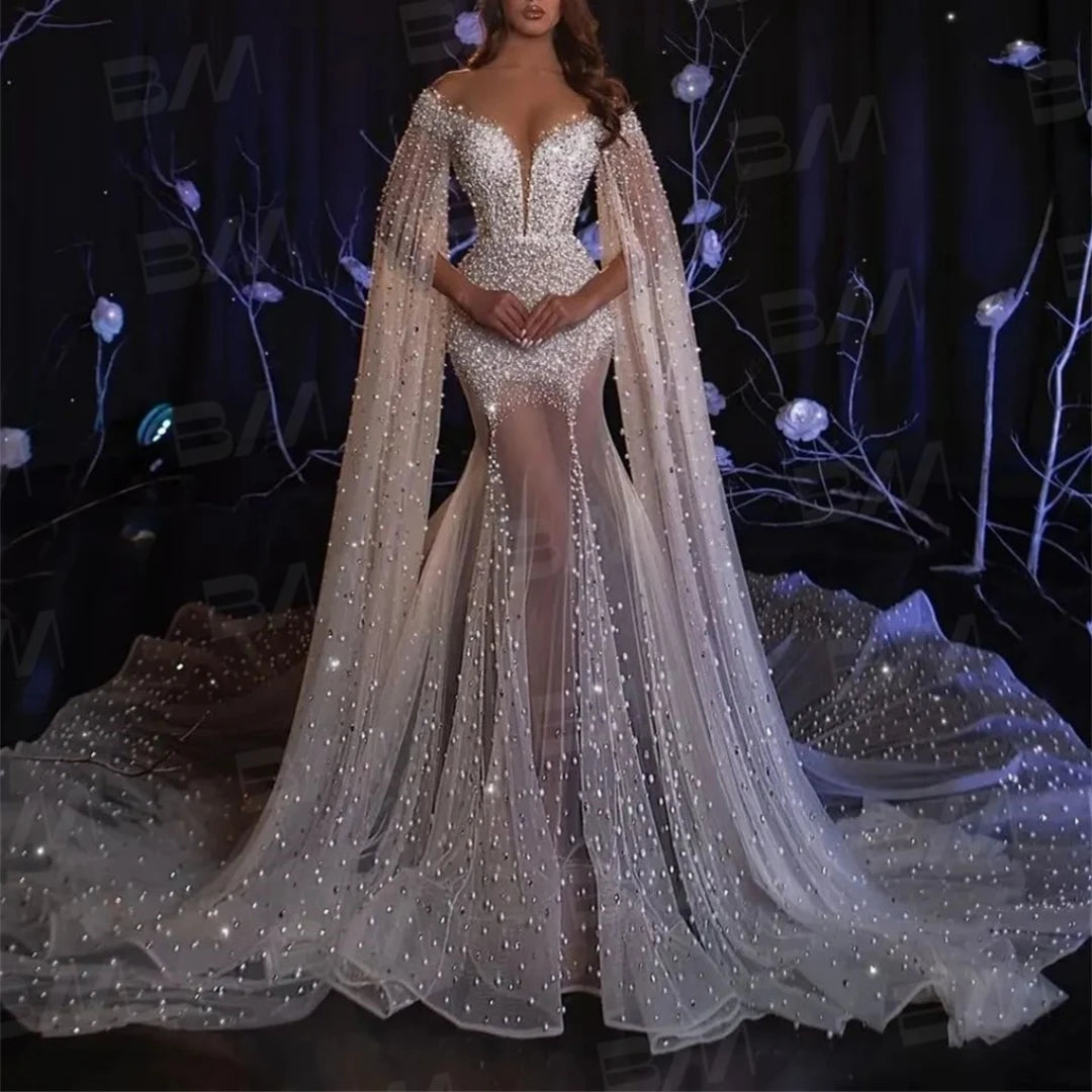 Pearls Mermaid Wedding Dress Long Cape Sleeve Deep V Neck Tulle Beaded Bride Dresses Luxury Bridal Gown For Bride Abito Da Sposa