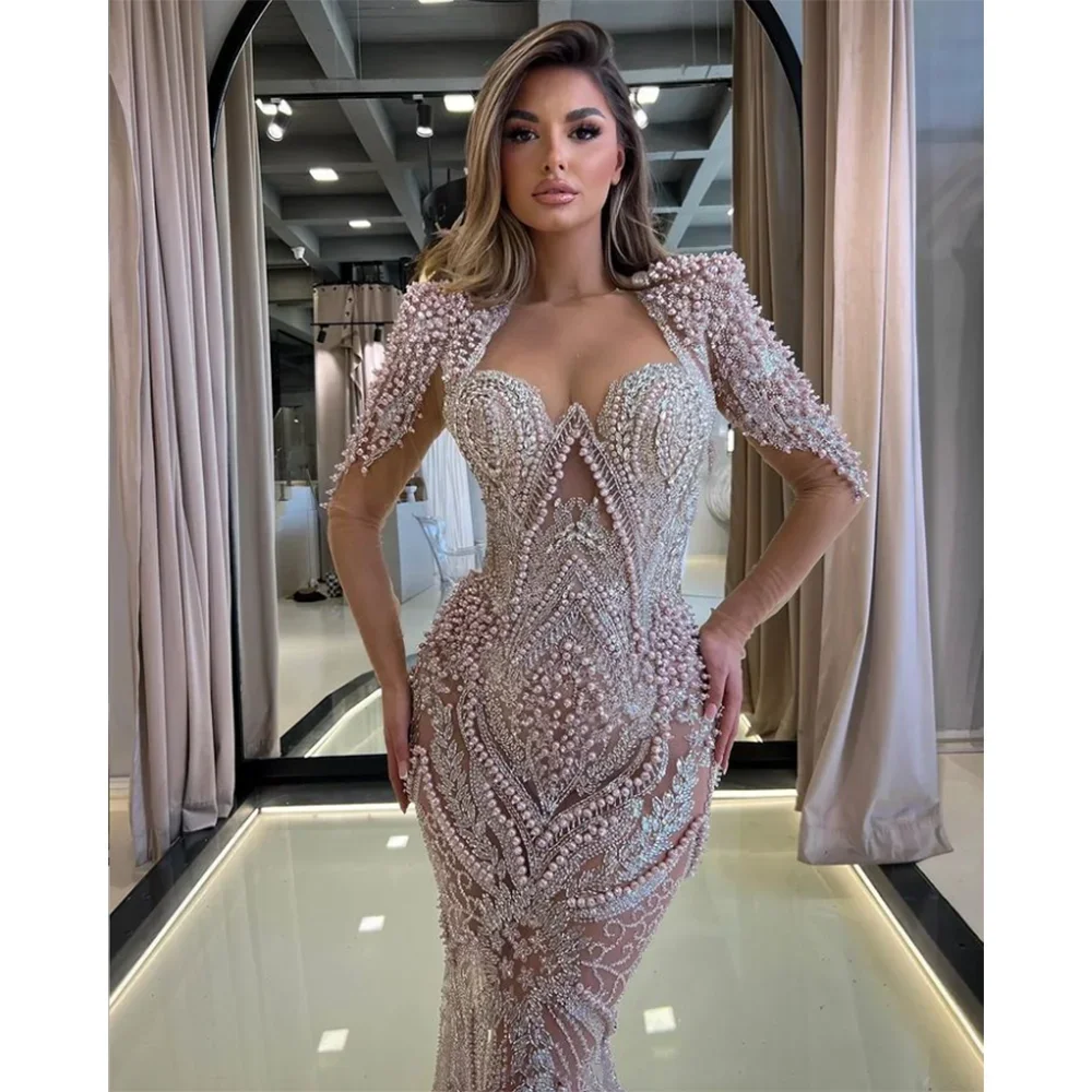 Pink Beading Pearls Prom Dress Luxury Sweetheart Lace Appliqued Sequined Mermaid Party Gowns Chic Floor Length Evening Dress