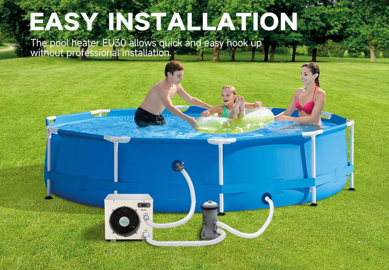 The EU30 can heat pools up to 2000 gallons,11' round or 7'X14' oval. However, if you reside in the northern regions, it’s recommended to choose one size larger. (e.g. model EU50)