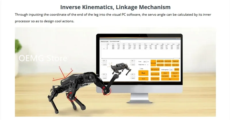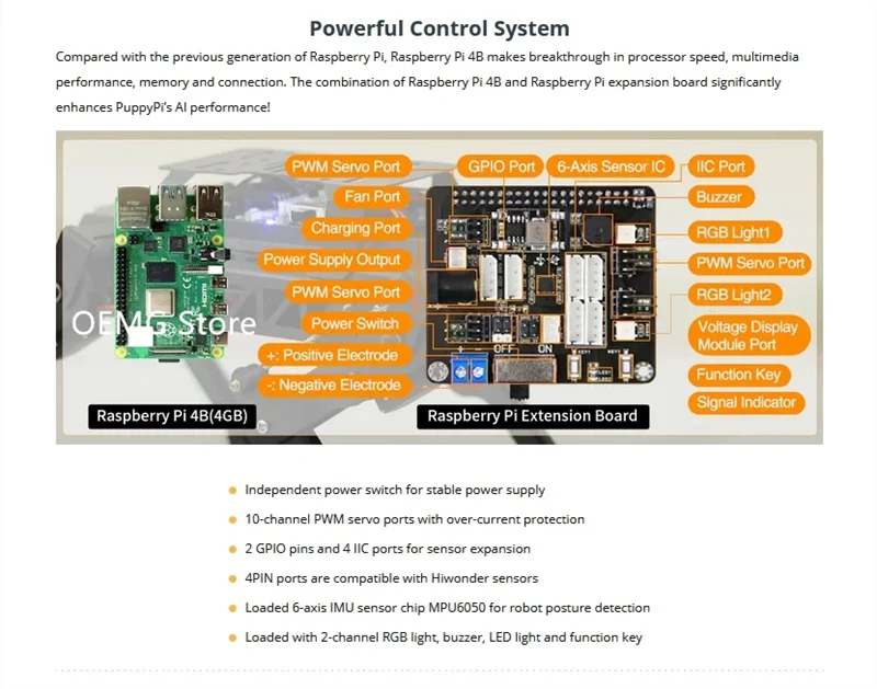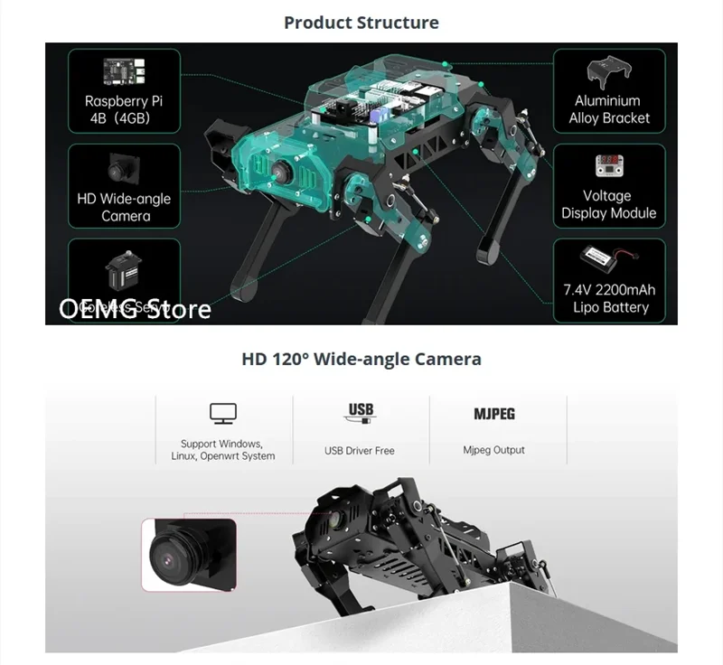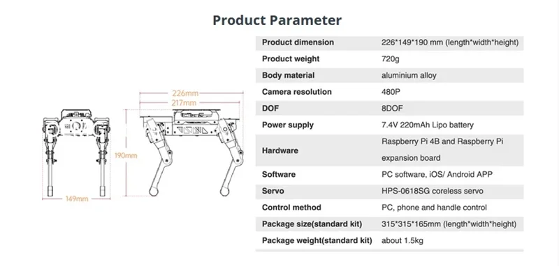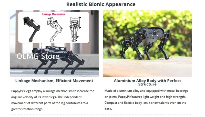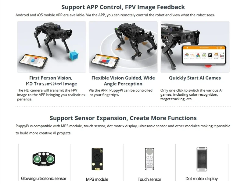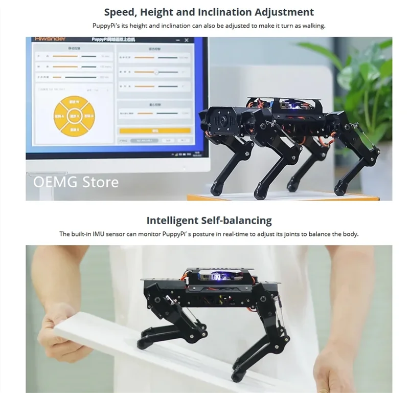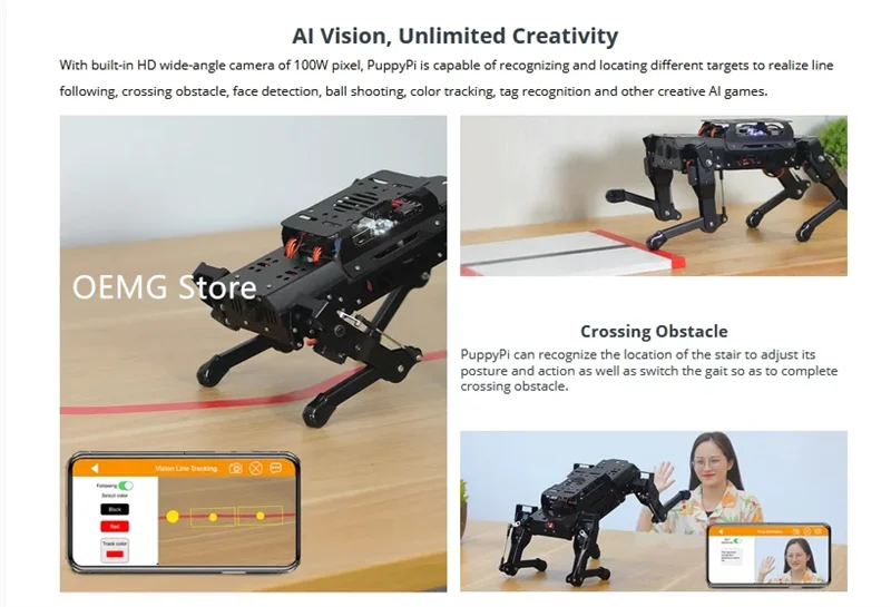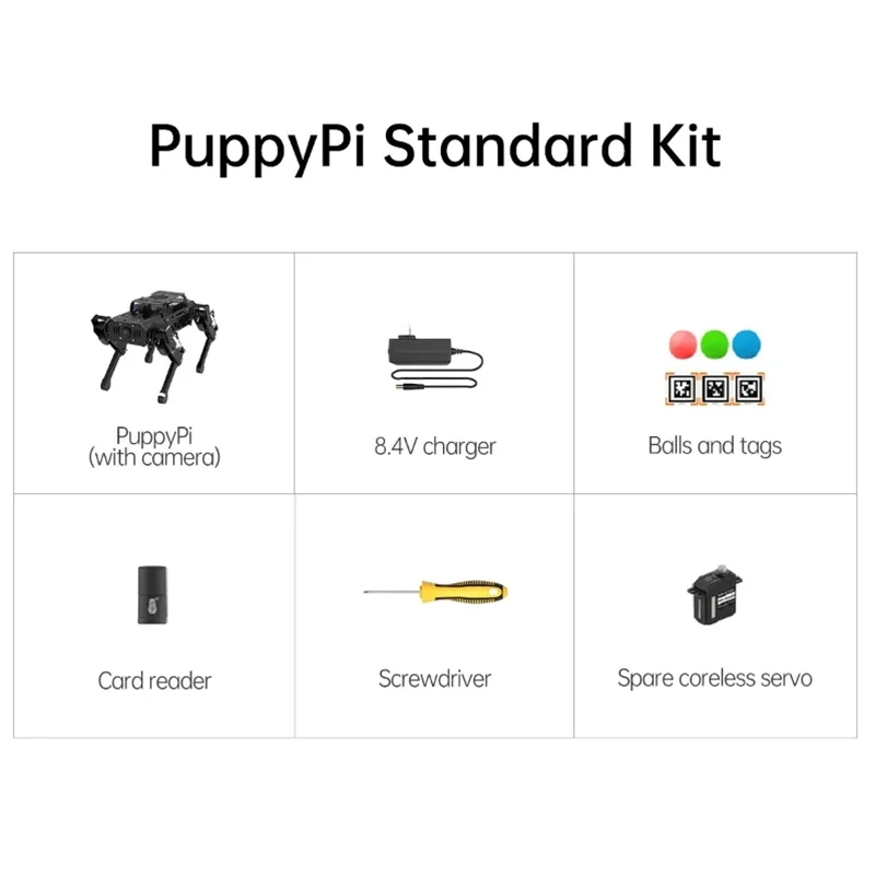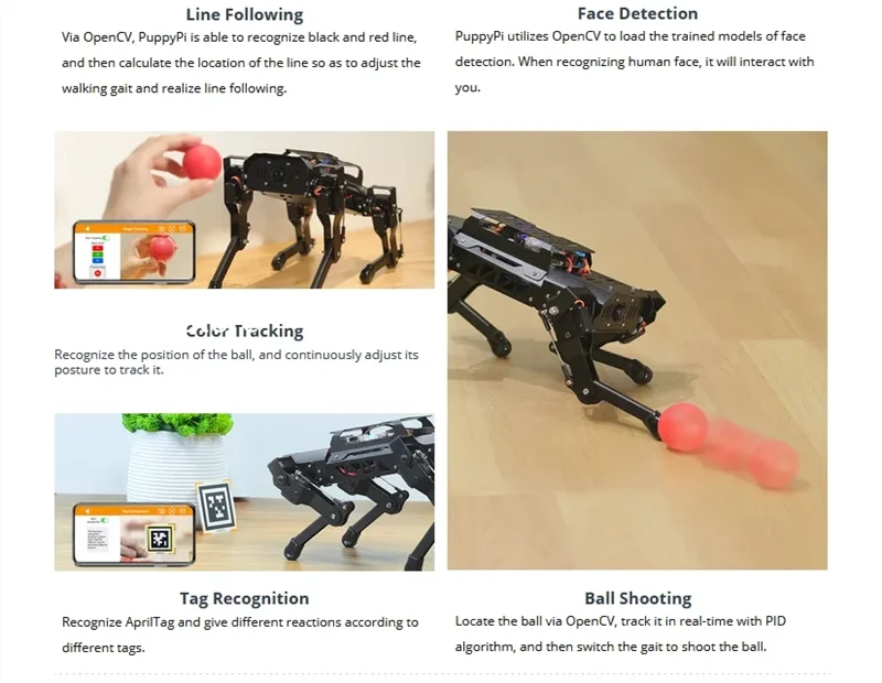Powered by Raspberry Pi 4B 4GB, PuppyPi is an AI vision quadruped robot. It is made of aluminium alloy and loaded with 8 powerful coreless servos. Linkage mechanism on its leg attributes to flexible and diverse actions and enables it to walk, step up and down stair, etc. It owns first person vision for realizing more interesting AI games, including target tracking, face detection, line following, auto climbing and so on.