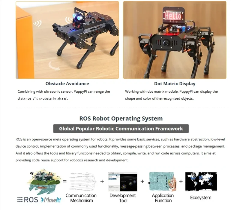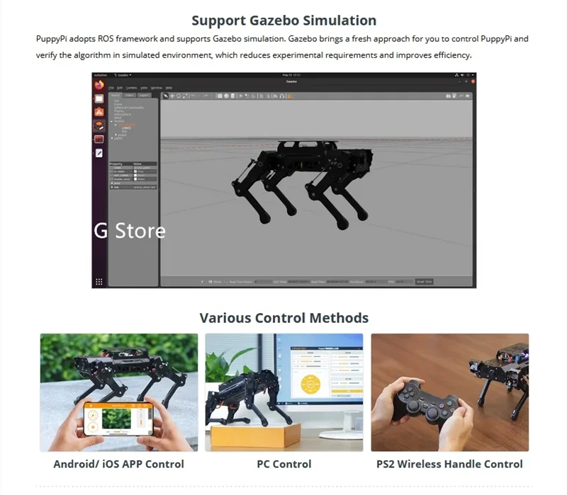 PuppyPi is based on ROS (robot operating system) and supports Gazebo simulation. It serves as a great platform for you to learn and verify machine vision, robot kinematics, quadruped gait controlling and other algorithms. Besides, ample tutorials and open-source codes will help you quickly get started!