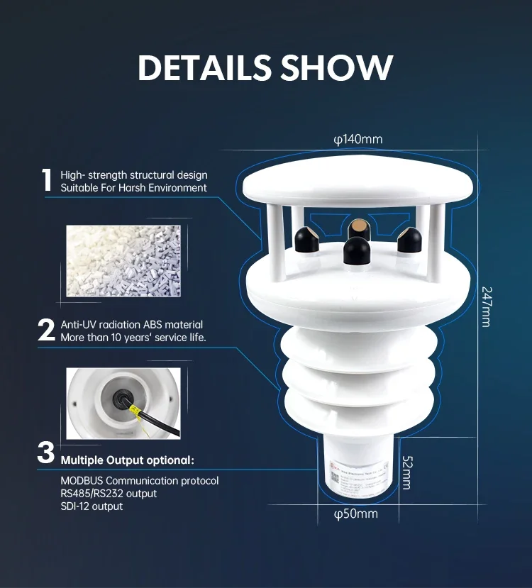 RK900-10 automatic weather instrument is simultaneously measure the atmospheric temperature, atmospheric humidity, wind speed, wind direction, air pressure and precipitation.Temperature, humidity and air pressure sensor is placed within the radiation shield.Wind speed and direction of ultrasonic principle.24G radar detection on rainfall, which can quickly detect rainfall and rainfall intensity.Internal GPS global positioning module and electronic compass can be mounted to the system to give a good indication of latitude and longitude and relative speed, which can calculate the real and virtual wind speed and direction, and is especially suitable for installation on motion vector, such as special vehicles or vessels, etc.