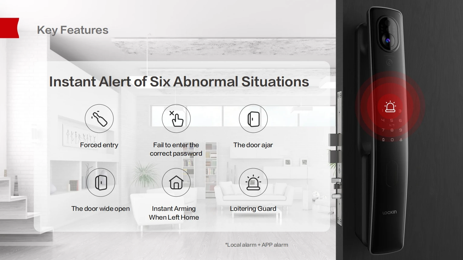 Forced Entry Alarm: Localalarm. App alarmBanned Retry Times: lf the password is entered incorrectly five times in a row,the fingerprint, password, and NFC unlocking functions will be locked for two minutes and analarm will sound.