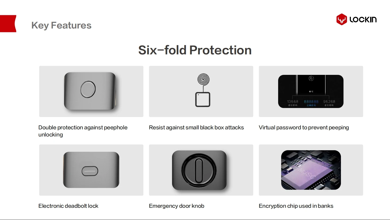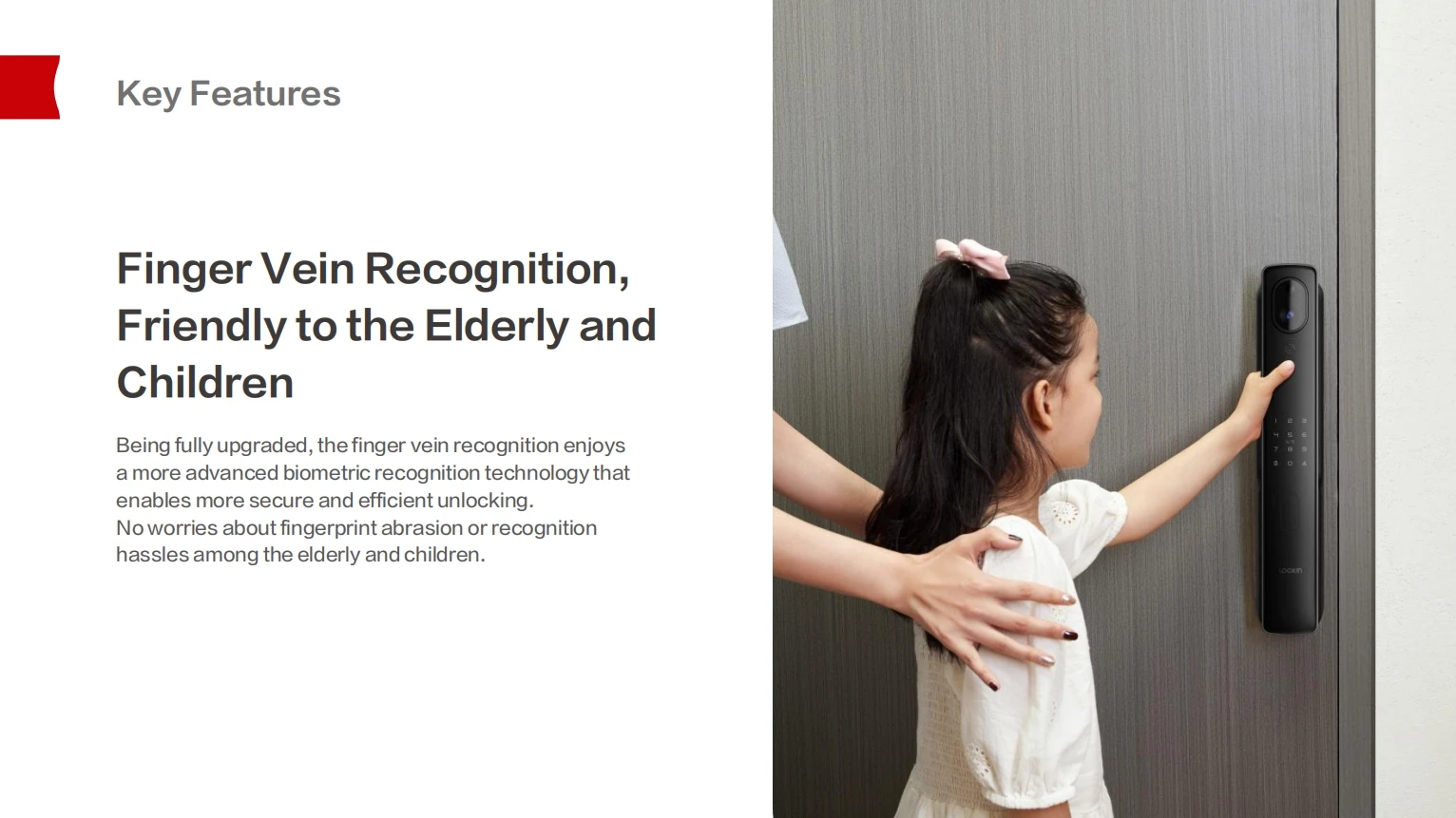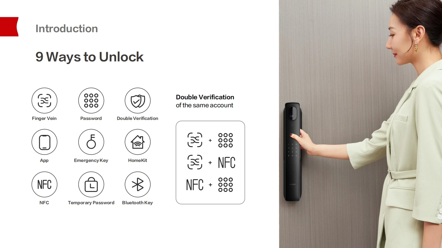 SPECIFICATIONSUnlocking Method: Finger Vein Recognition /Homekit/ APP /Password/Double Authentication /Temporary password (one-time or periodic) / Key/ NFC /Bluetooth keyMaterials: Aluminium alloy