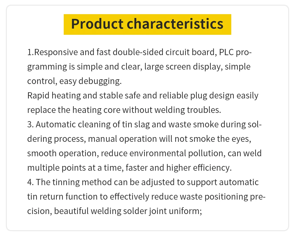 This product is specially designed for the welding of switches, LED lights, terminals, resistance sensors, thermistors, sensors, aviation heads, etc .. circuit boards and wiring harness.