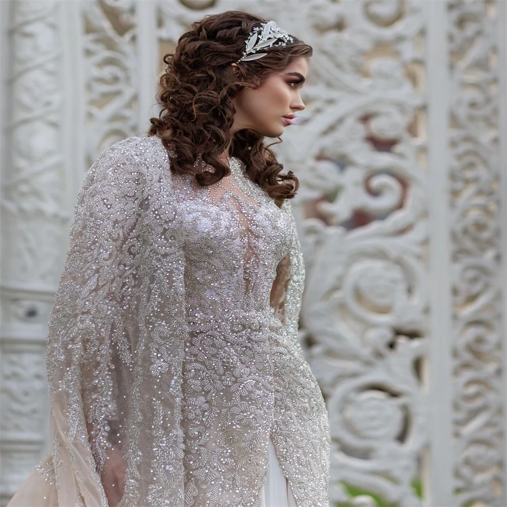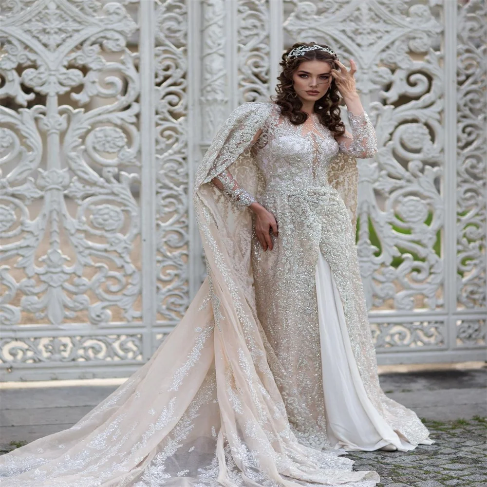 Women Luxury Beaded Bridal Mermaid Wedding Dress Floral Ruffles Sparkly Illusion