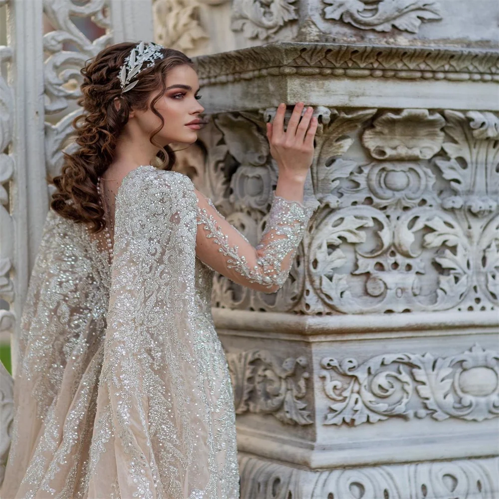 Sexy O-neck Dress For Bride Luxury Long Sleeve Lace Beadings Bridal Gown Romantic Floor-length Robe De Mariée