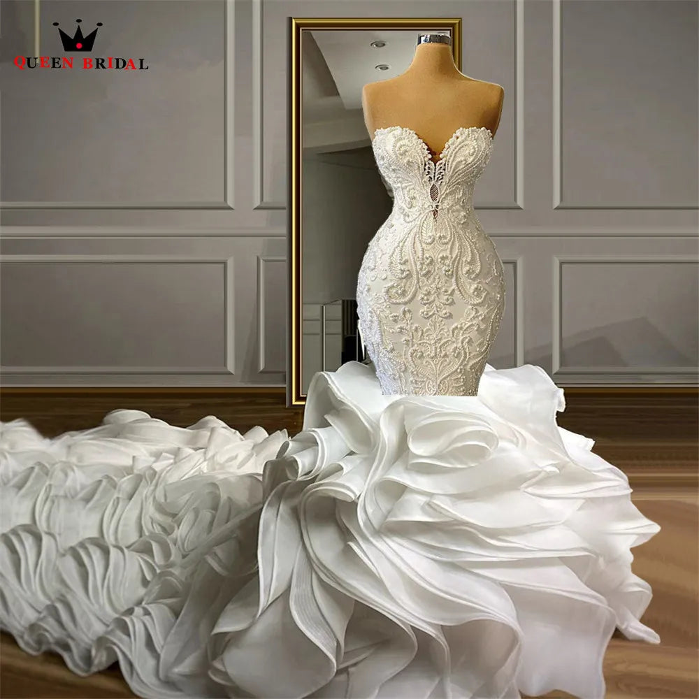 Women Luxury Beaded Bridal Mermaid Wedding Dress Floral Ruffles Sparkly Illusion