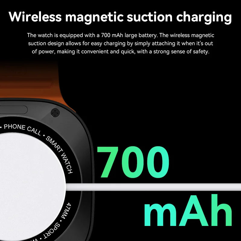 The watch is equipped with a 700 mAh large battery. The wireless magnetic suction design allows for easy charging by simply attaching it when it's out of power, making it convenient and quick, with a strong sense of safety