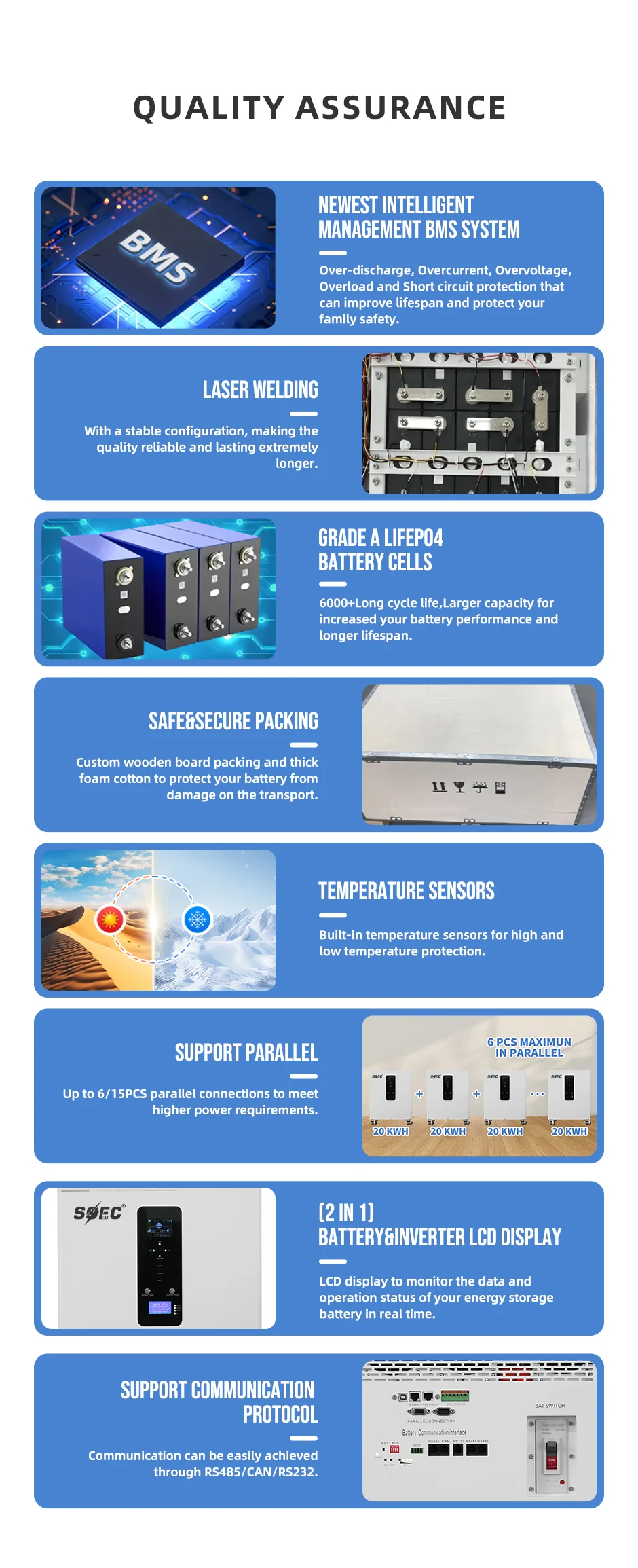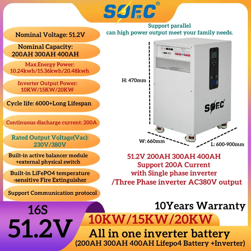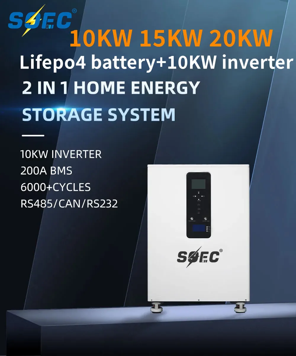 SOEC 20KW 15KW 10KW lithium LiFePO4 battery 48v 200ah 300AH 400AH 51.2V PowerWall with BMS&10KW Inverter&MPPT 10Years Warranty