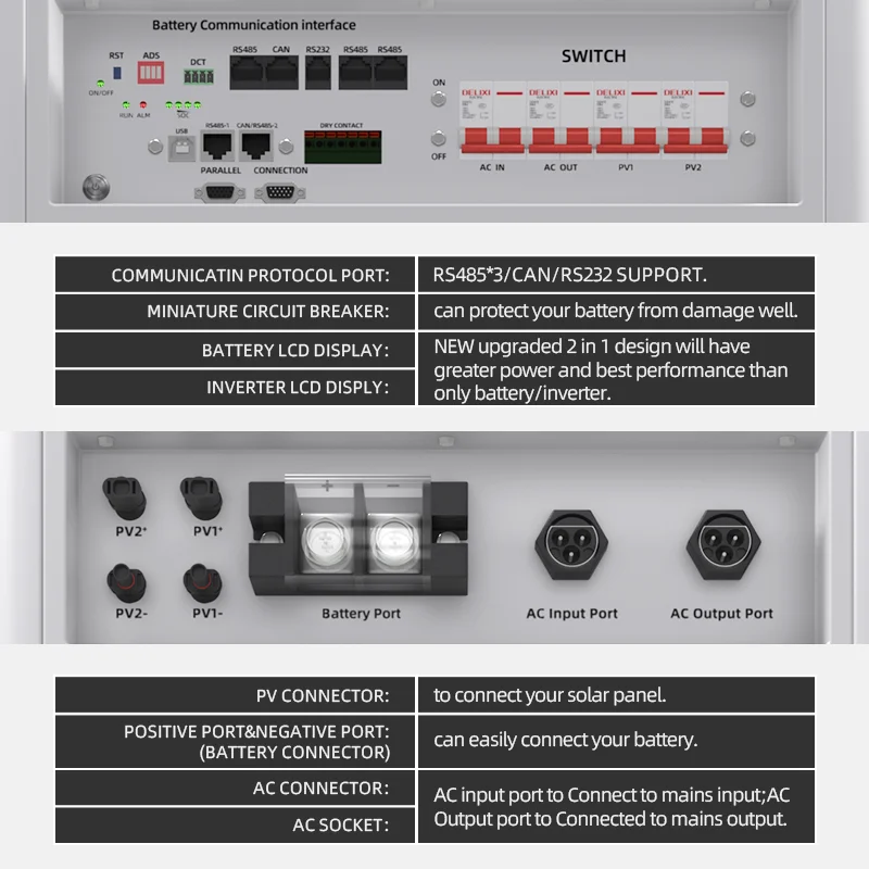 1. Support RS232/RS485/CAN Communication Protocol/reach to 15pcs Parallel to achieve greater 300KWH energy storage energy.