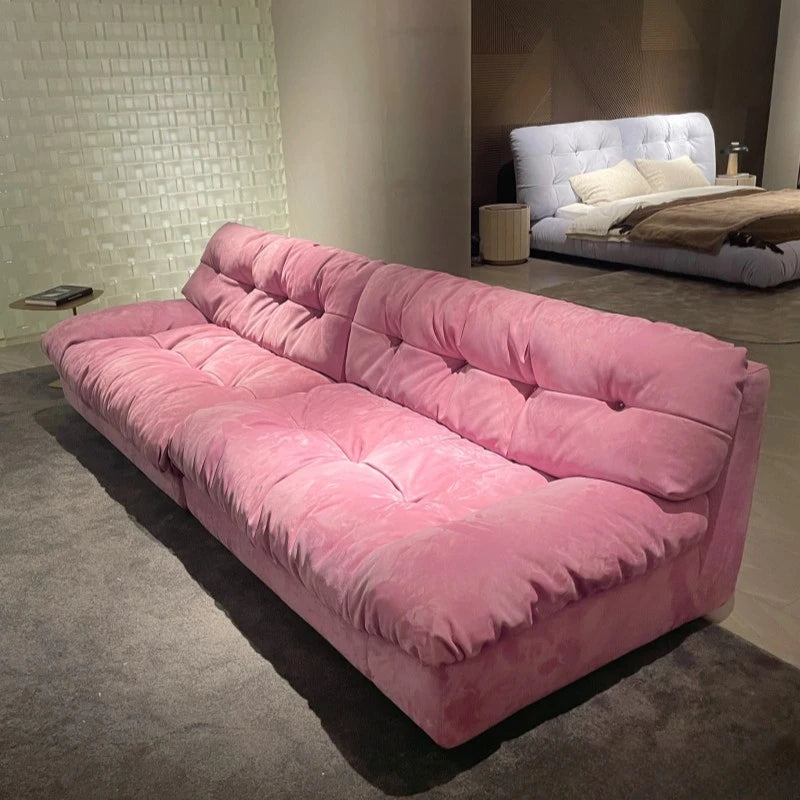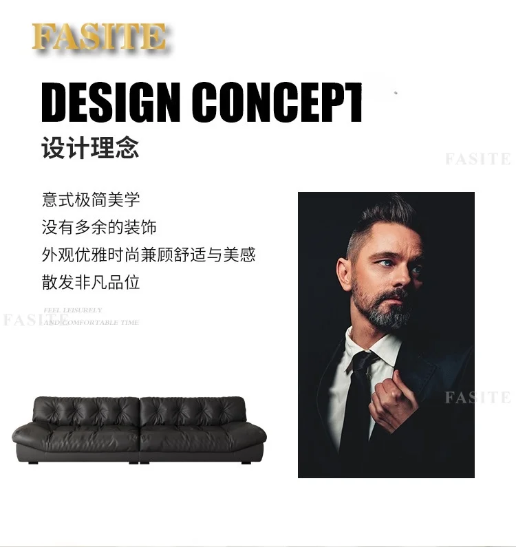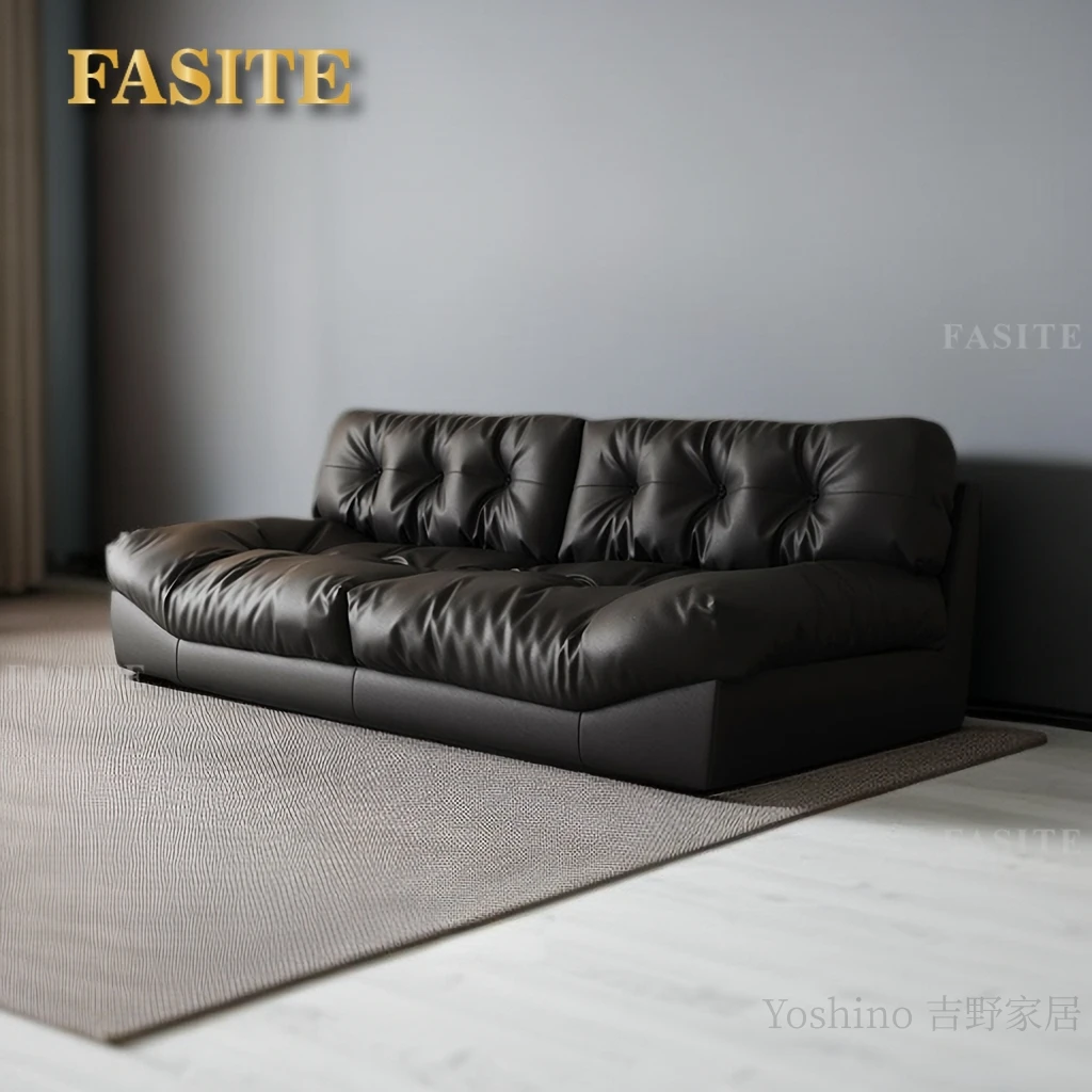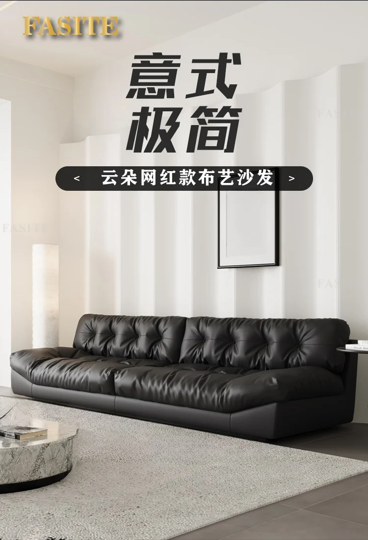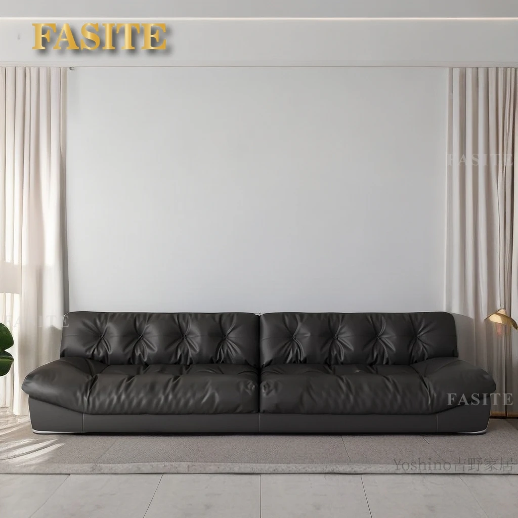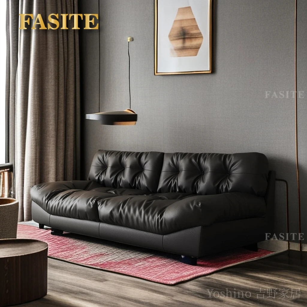Sofa top layer cowhide technology fabric small apartment living room black straight row three people.