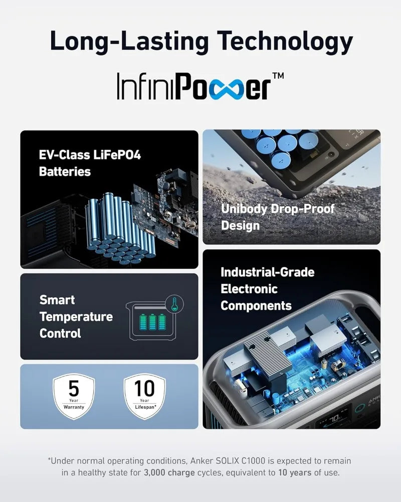 - A Decade of Power: Trust in a decade-long journey with the Anker SOLIX C1000 Portable Power Station, featuring exceptional battery longevity with its LiFePO4 Battery, offering 3,000 battery cycles over a 10-year lifespan, ensuring reliability for years to come.