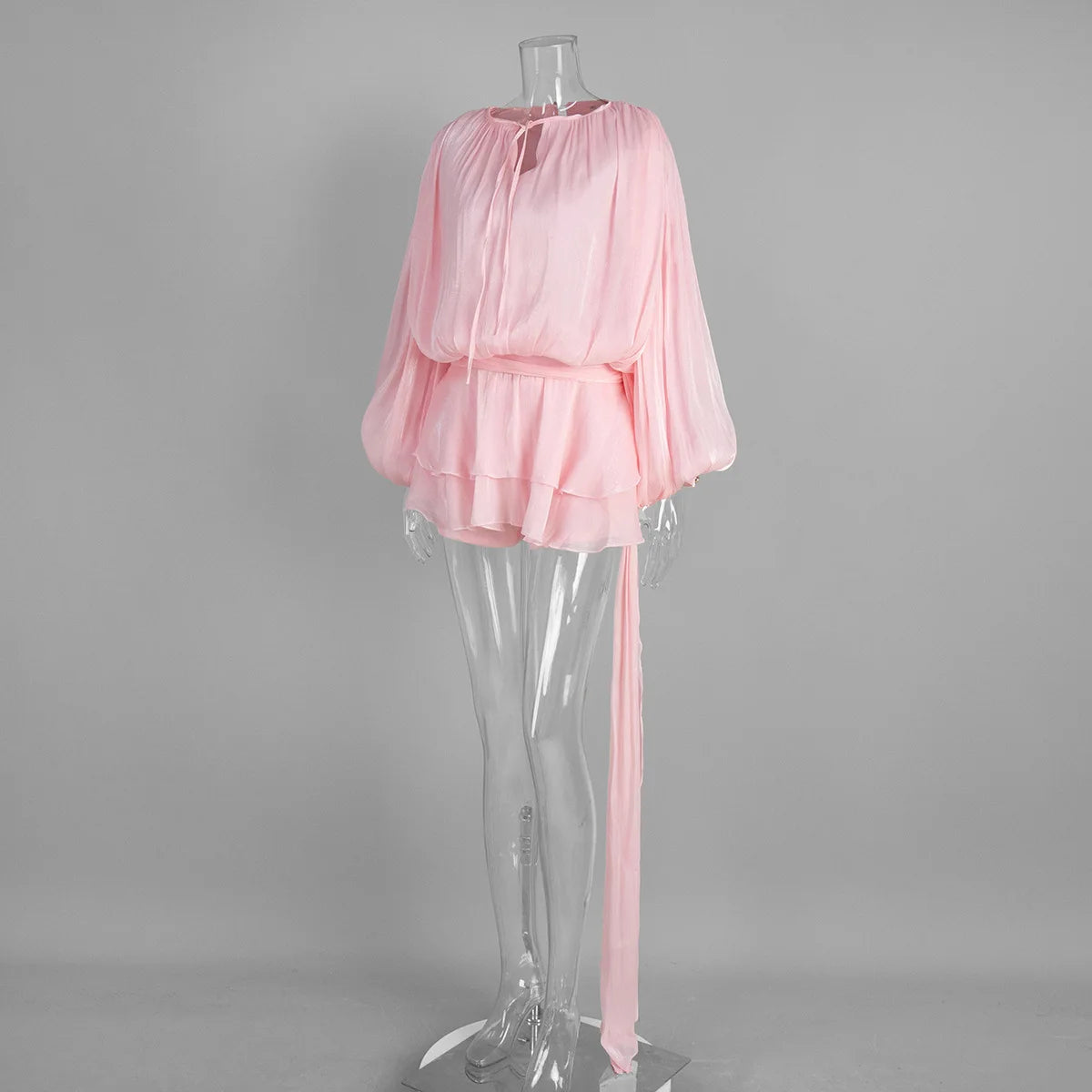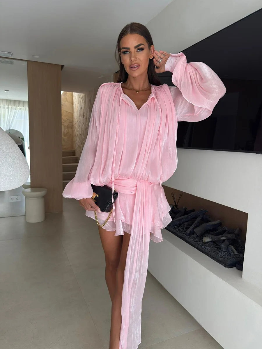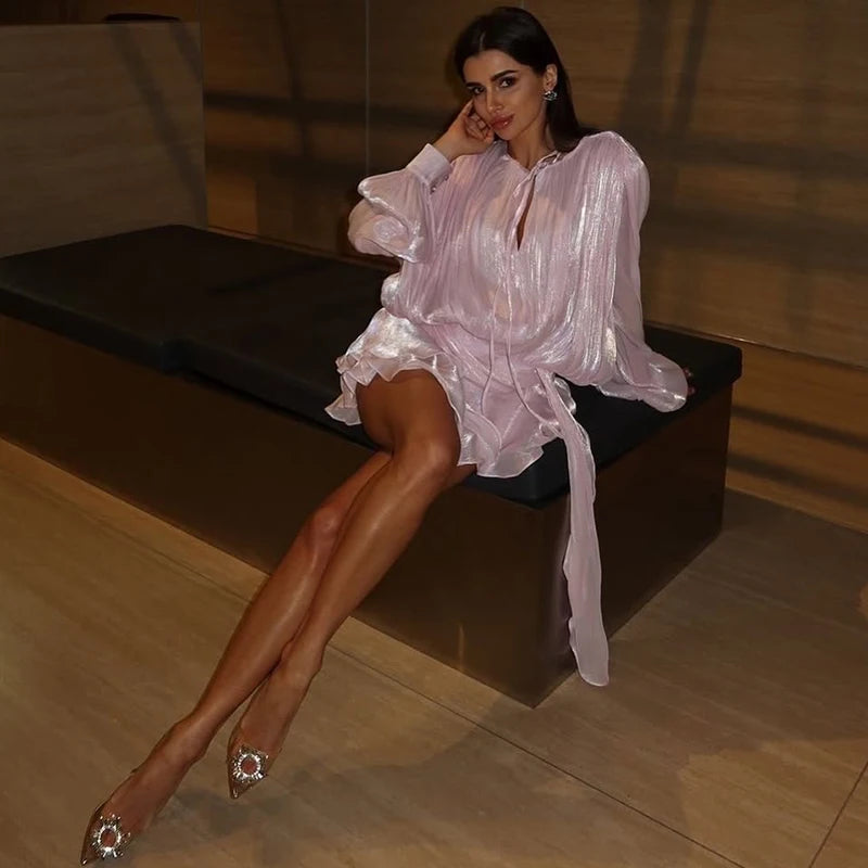 Tornova Chiffon Long Sleeve Dress Sets Female Lace Up Lantern Sleeve Elegant Ruffled Dress High Street Sexy Perspective Outfits
