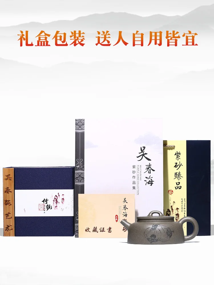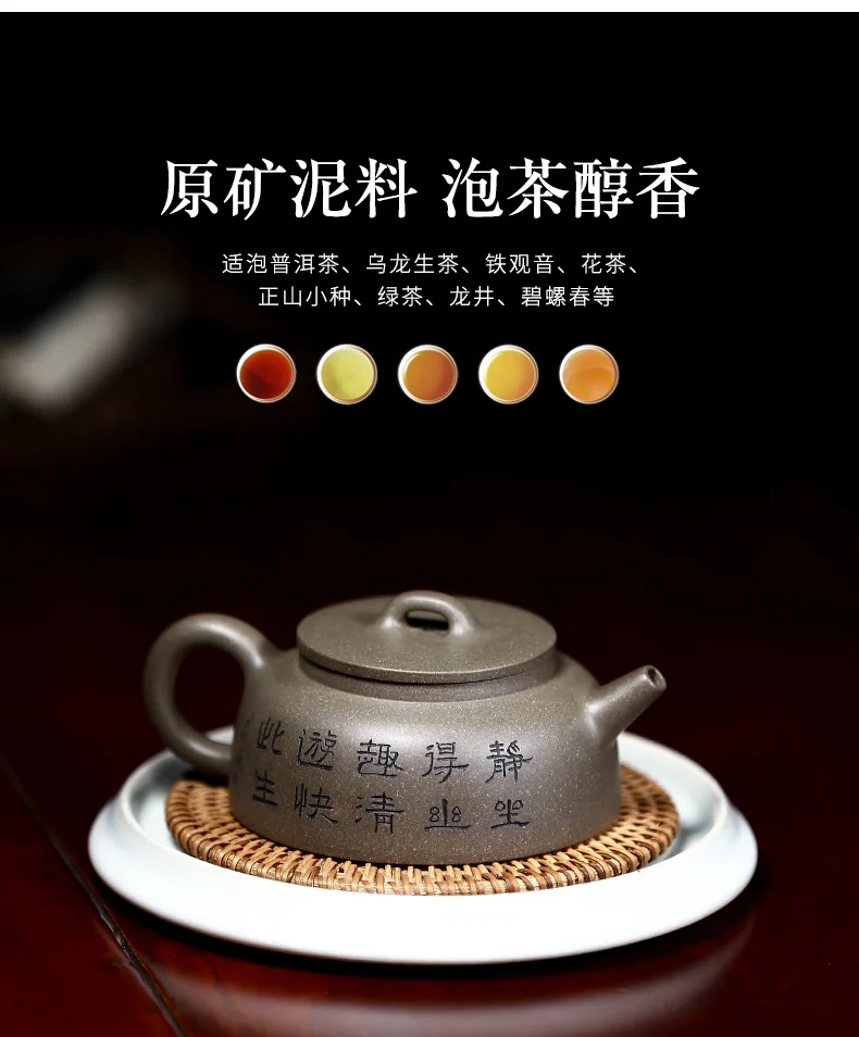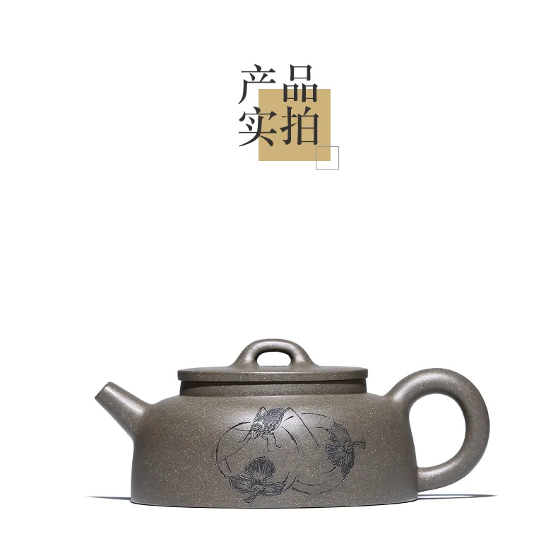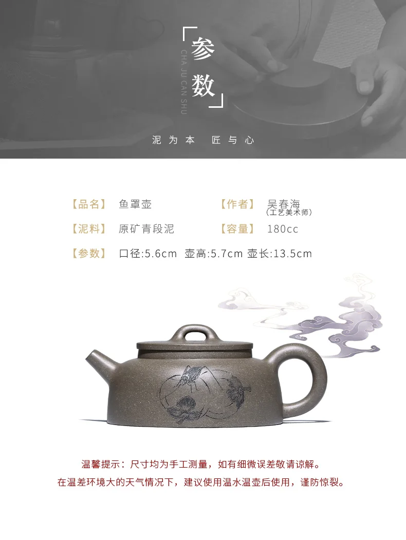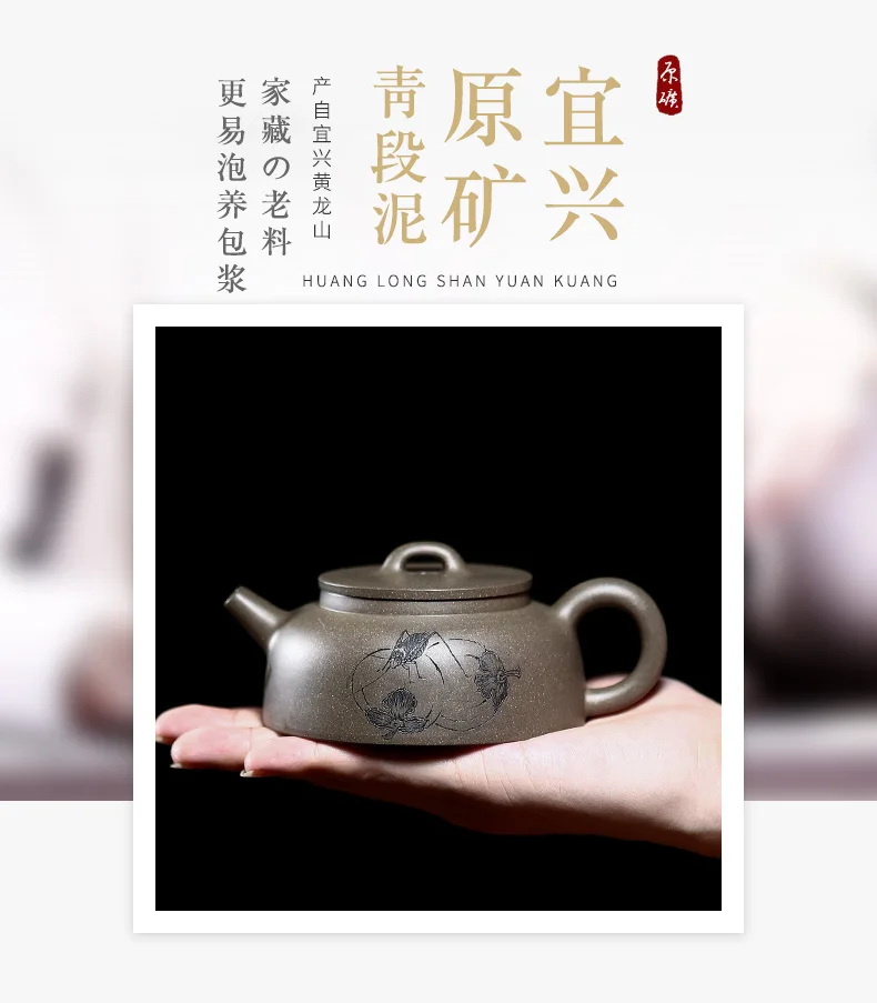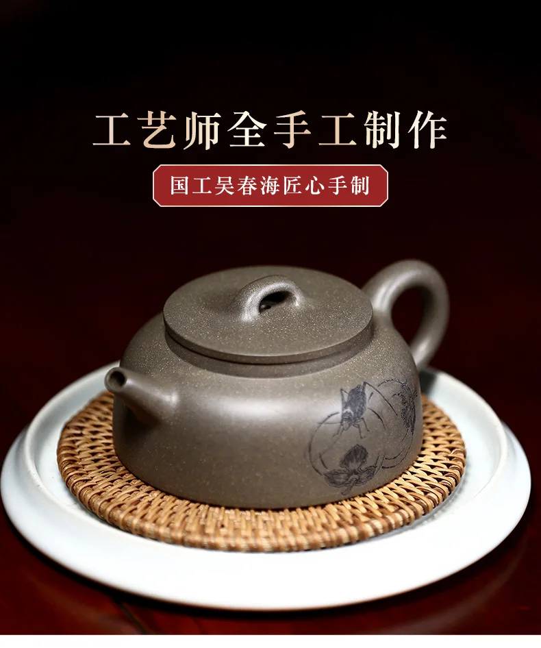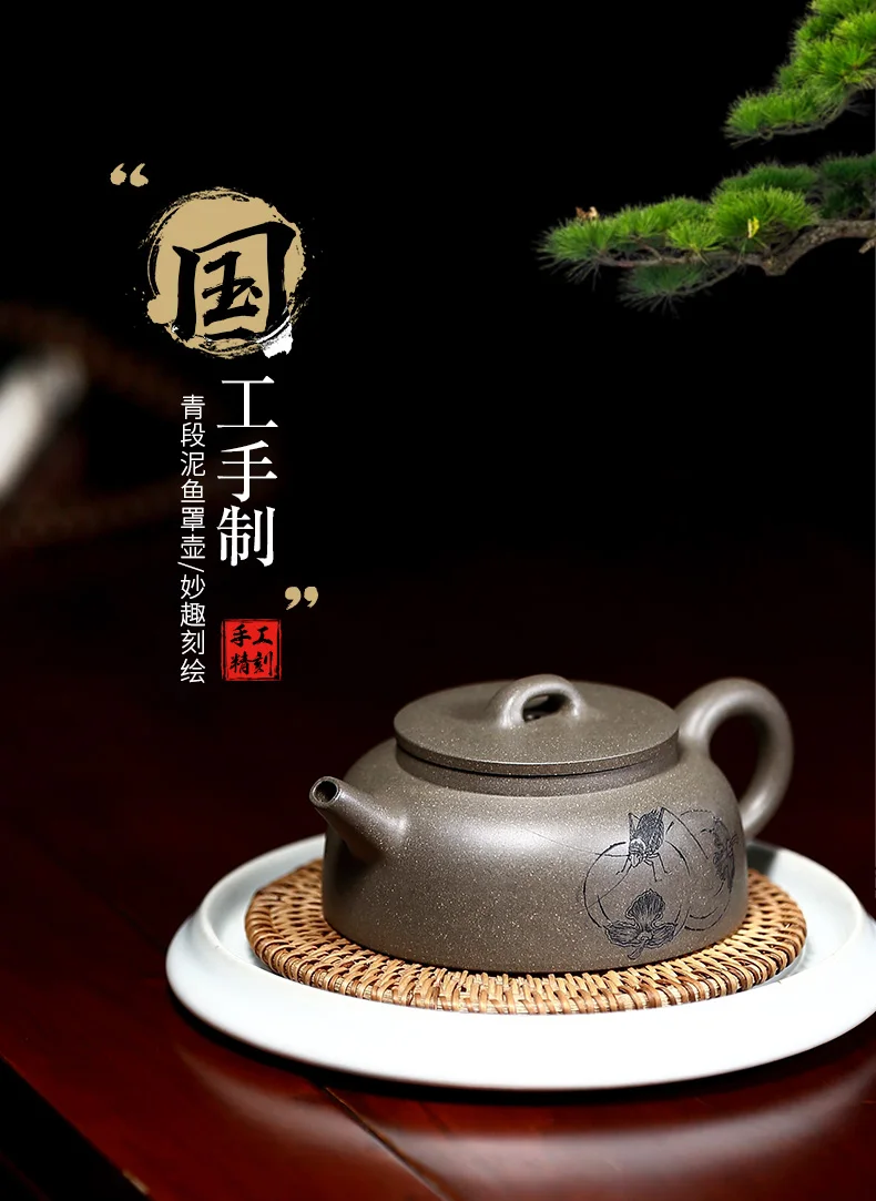 |True art engraving pure manual teapot yixing are recommended by kung fu tea green cover period of mud fish pot