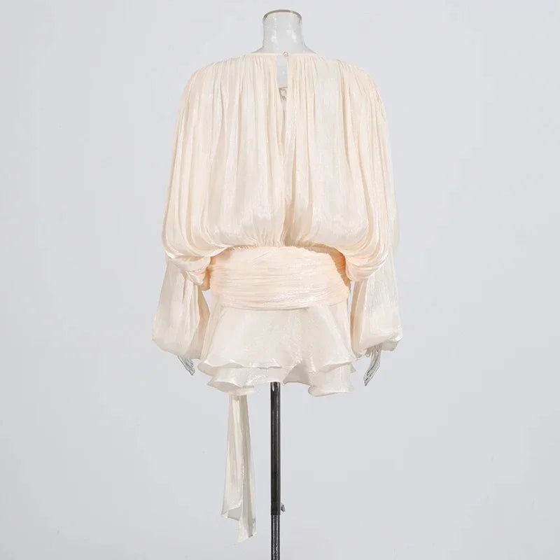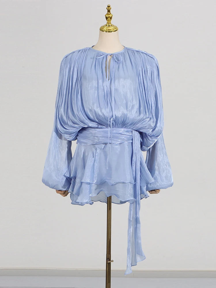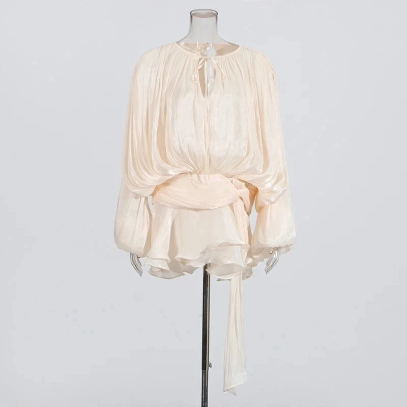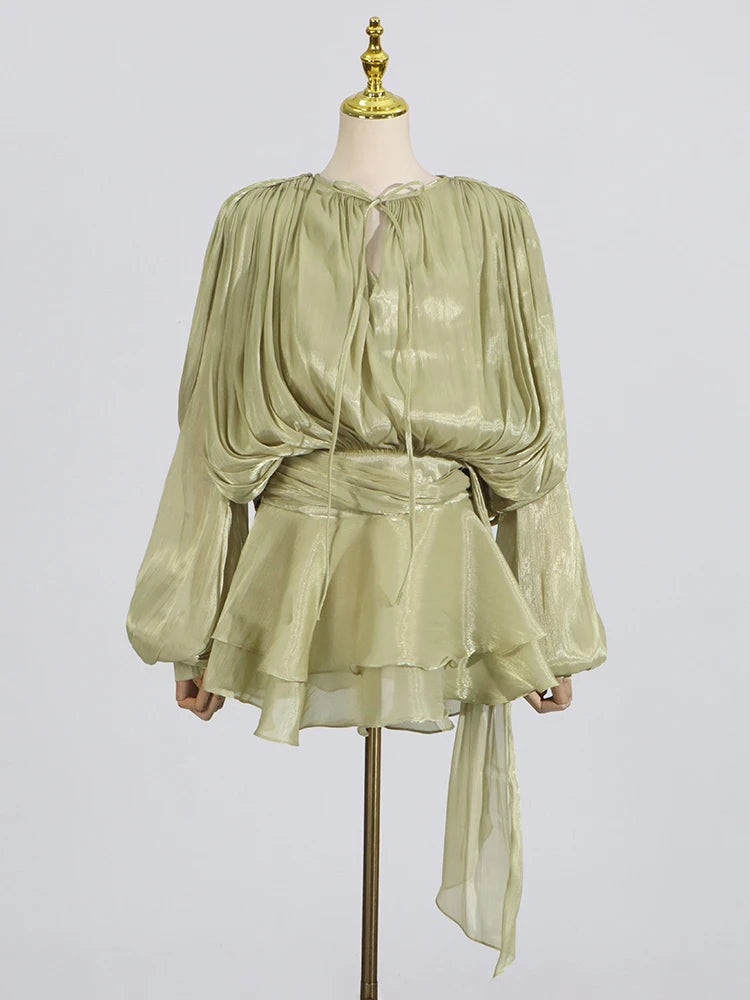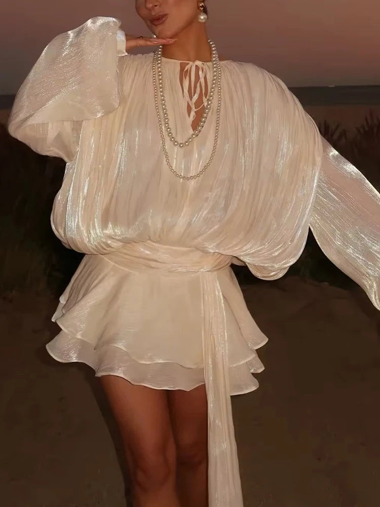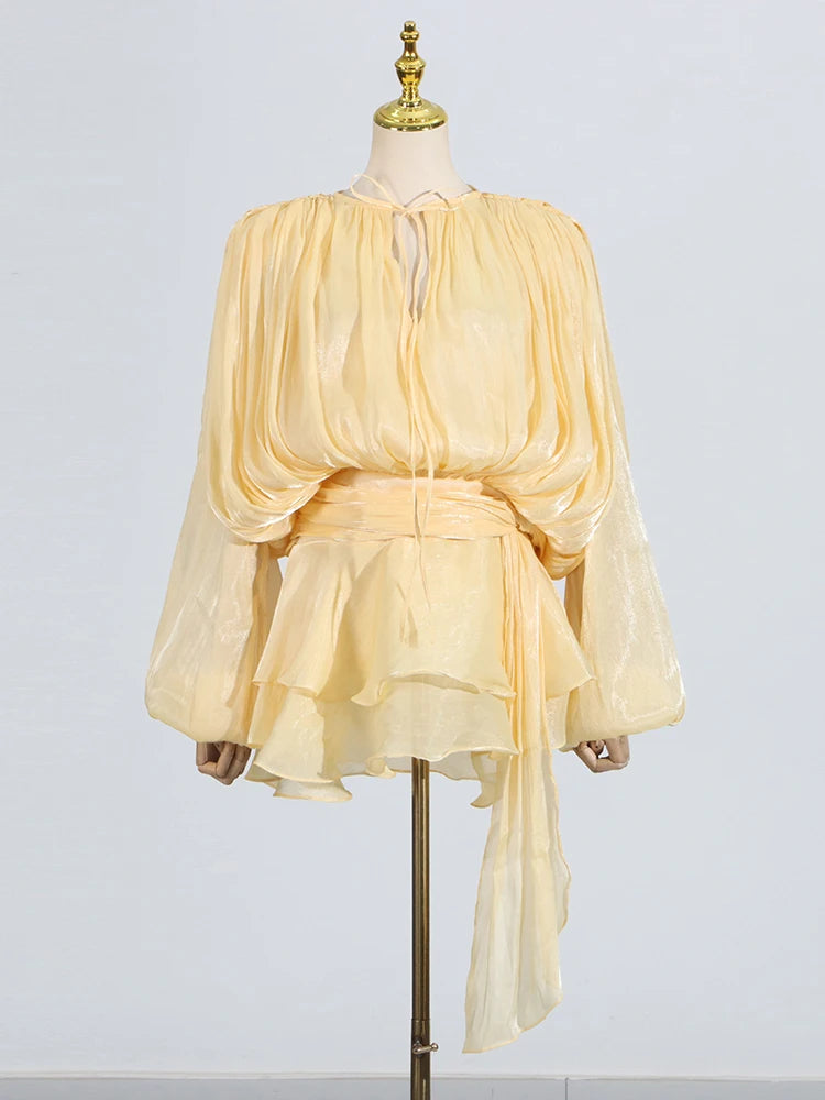 TWOTWINSTYLE Loose Solid Dresses For Women Round Neck Lantern Sleeve High Waist Spliced Fold Mini Chic Dress Female Fashion 2025