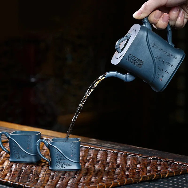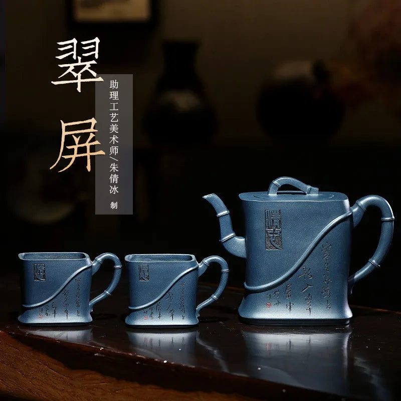 Zanghutianxia Yixing Hand-Carved Authentic Purple Clay Pot Azure Green Mud Country Aid Kombucha Pot Sets Cuiping Cuiping